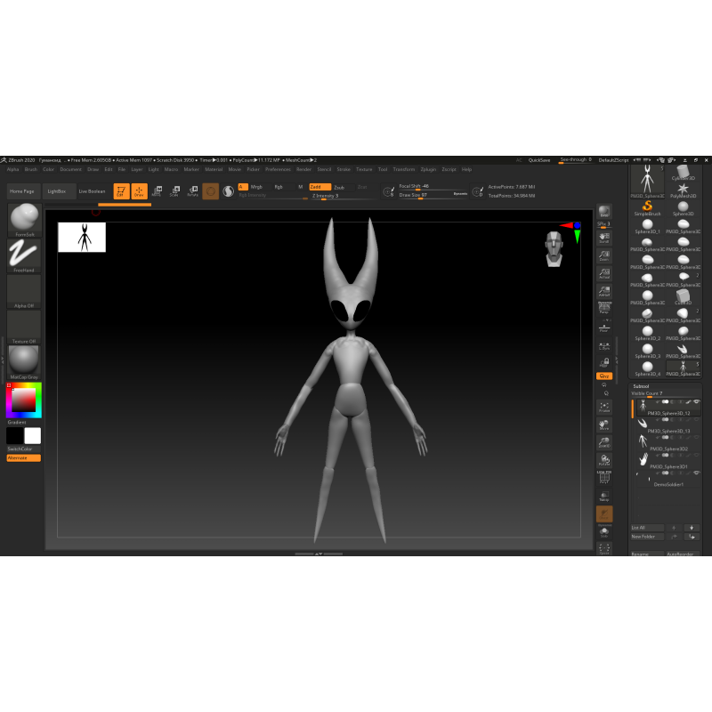 ZSpheres – инструмент для создания своеобразного каркаса, на основе которого будет сформирована будущая полигональная сетка. Этот процесс похож на создание проволочного каркаса скульптуры в настоящей жизни. Для упрощения работы с ZSphere в программе существует библиотека Mannequins с готовыми каркасами людей и животных. Взяв за основу один из таких ассетов можно быстро настроить желаемую позу, а затем начать формирование меша на основе полученного силуэта, что удобно для создания быстрого концепт-арта в 3D.